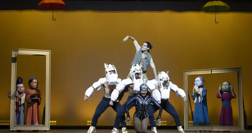 Las máscaras y tocados, modelados y vaciados a mano, dotaron a los personajes de una teatralidad onírica. Los caballos de Botero, por ejemplo, parecían haber galopado directamente desde un lienzo a la escena, desencadenando exclamaciones de asombro entre el público.