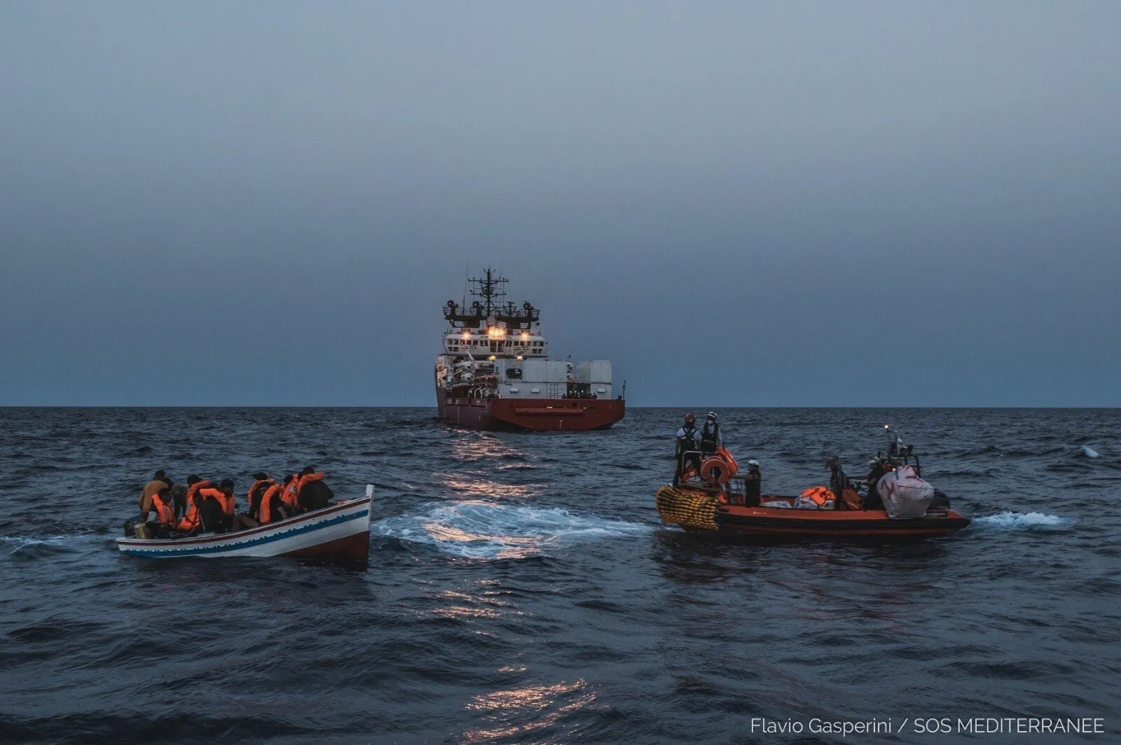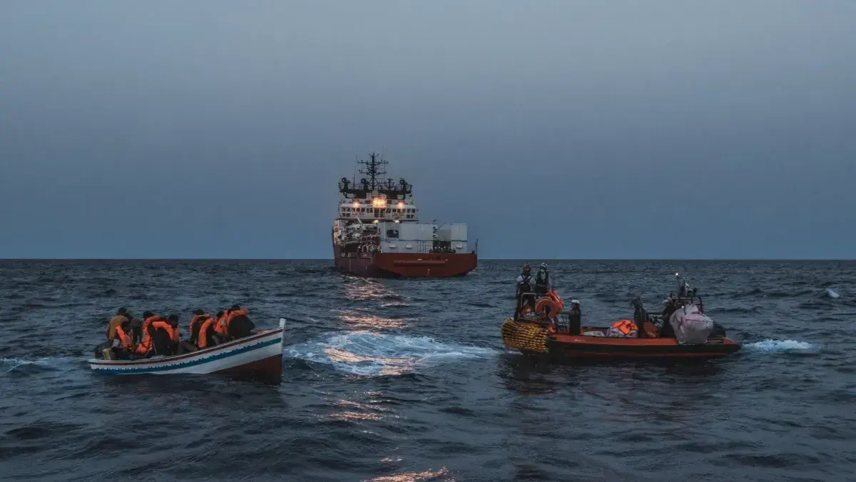 "En medio de la noche, OceanViking avistó, a solo 200 metros, a gente a la deriva en la oscuridad, en el mar. Inmediatamente, los equipos de SOSMedItalia rescataron a 44 personas, entre ellos 4 mujeres y 5 menores", reveló la ONG.