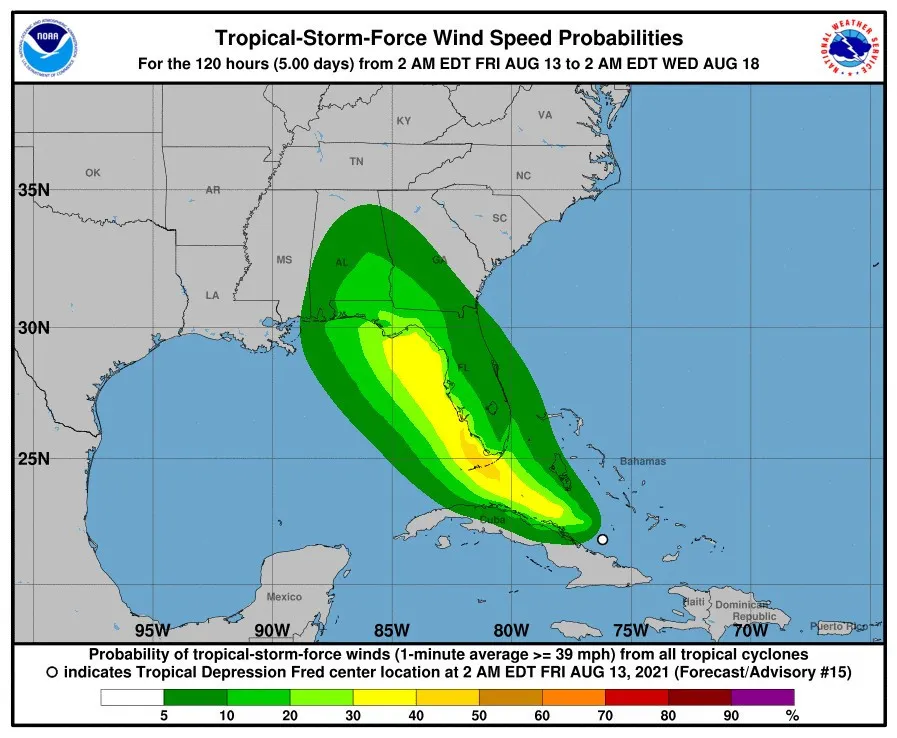 Fred, la sexta tormenta tropical de este año, puede producir este fin de semana lluvias intensas en los Cayos de Florida, en el sur y centro de este estado, y luego en el Big Bend de Florida, en el norte del estado, en algunos casos hasta 10 pulgadas (250 milímetros), con riesgo de inundaciones repentinas, crecidas de los ríos y deslizamientos de tierra.