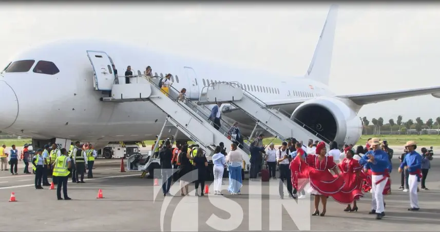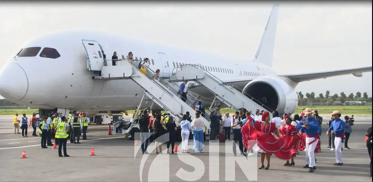 Al ritmo del Ballet Folklórico del Ministerio de Turismo fue recibido el primer vuelo desde Madrid a Santiago de los caballeros con pasajeros, la tripulación y los ejecutivos de la línea aérea.