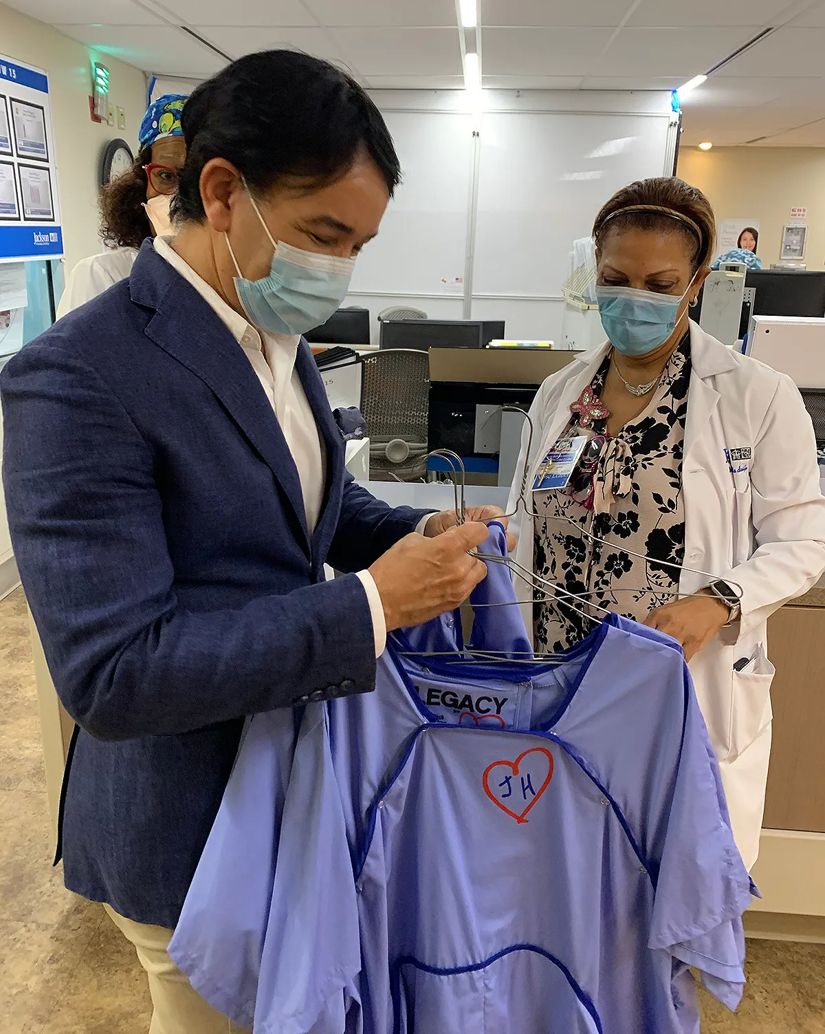 Las prendas creadas por el diseñador son azules, cuentan con prácticos botones a presión y aberturas y llevan las iniciales JH de Jackson Health dentro del ícono del corazón rojo característico de la marca René Ruiz.