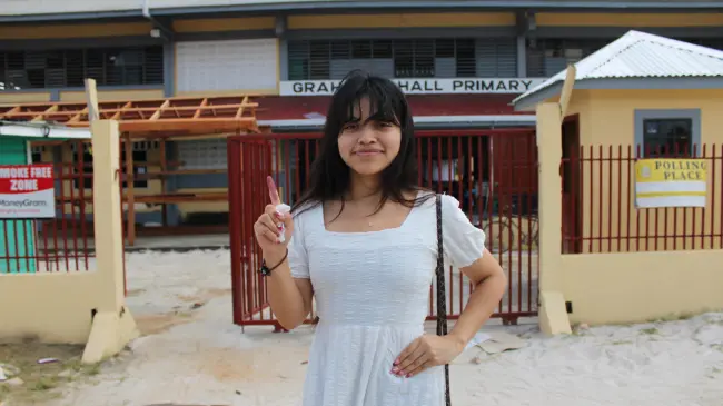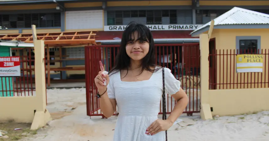 Angeline Antone posa luego de votar este lunes, en Georgetown (Guyana). Los guyaneses acudieron a las urnas para elegir presidente y miembros del Parlamento para los próximos cinco años, divididos entre apostar por la continuidad que representa Irfaan Ali o dar la oportunidad a los programas de los nuevos candidatos.