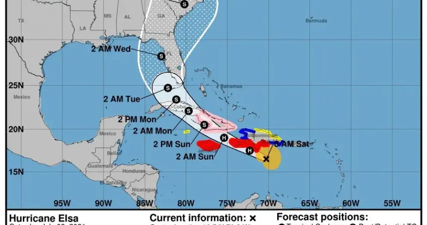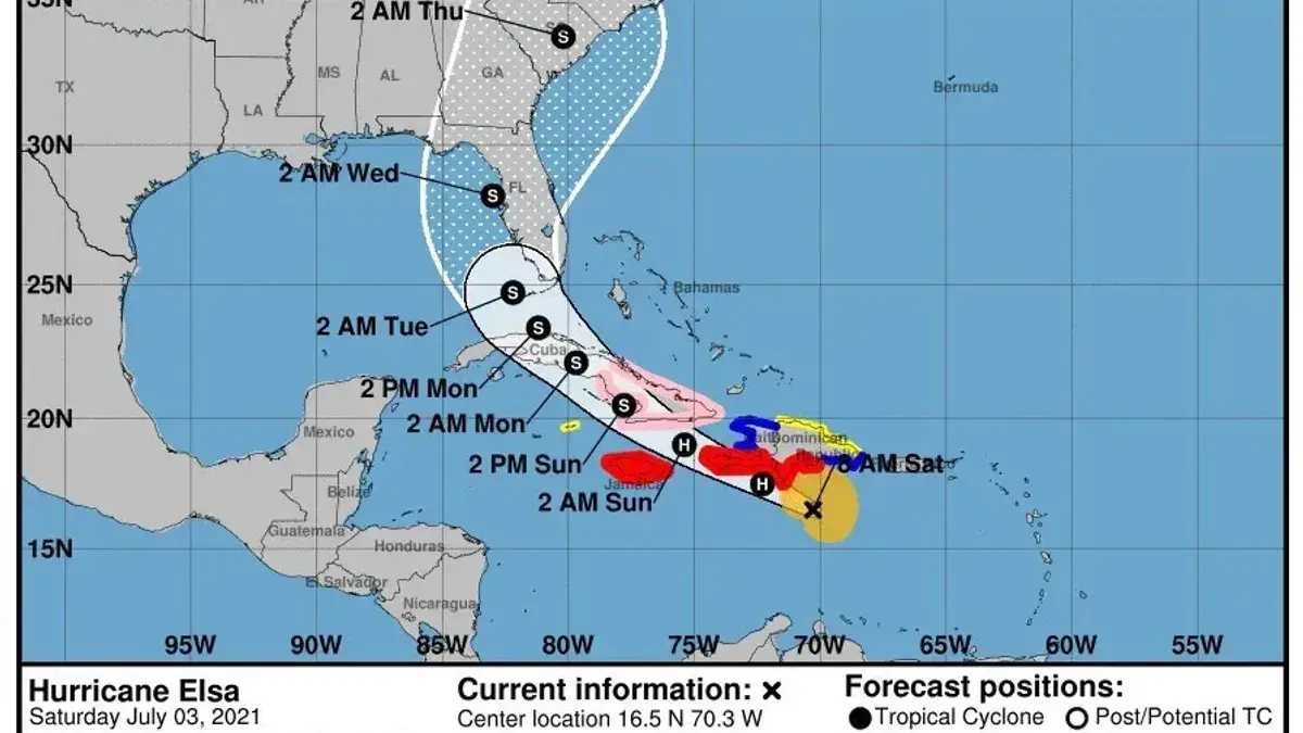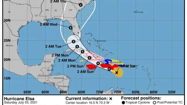 La agencia meteorológica informó en el boletín de las 8:00 a.m. que el ciclón estaba a una distancia de 110 millas al sureste de la isla Beata en República Dominicana, aún como huracán categoría 1. El ojo de Elsa está ubicado en la latitud 16.5 grados Norte y longitud 70.3 grados Oeste.