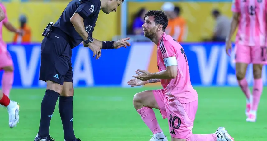 Messi, del Inter Miami, participa en el inaugural del Mundial de Clubes FIFA contra Al Ahly, siendo dirigido por el árbitro en el Hard Rock Stadium.