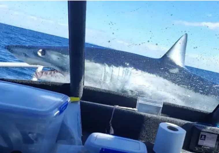 El momento en que un gran tiburón salta encima de un barco de pesca