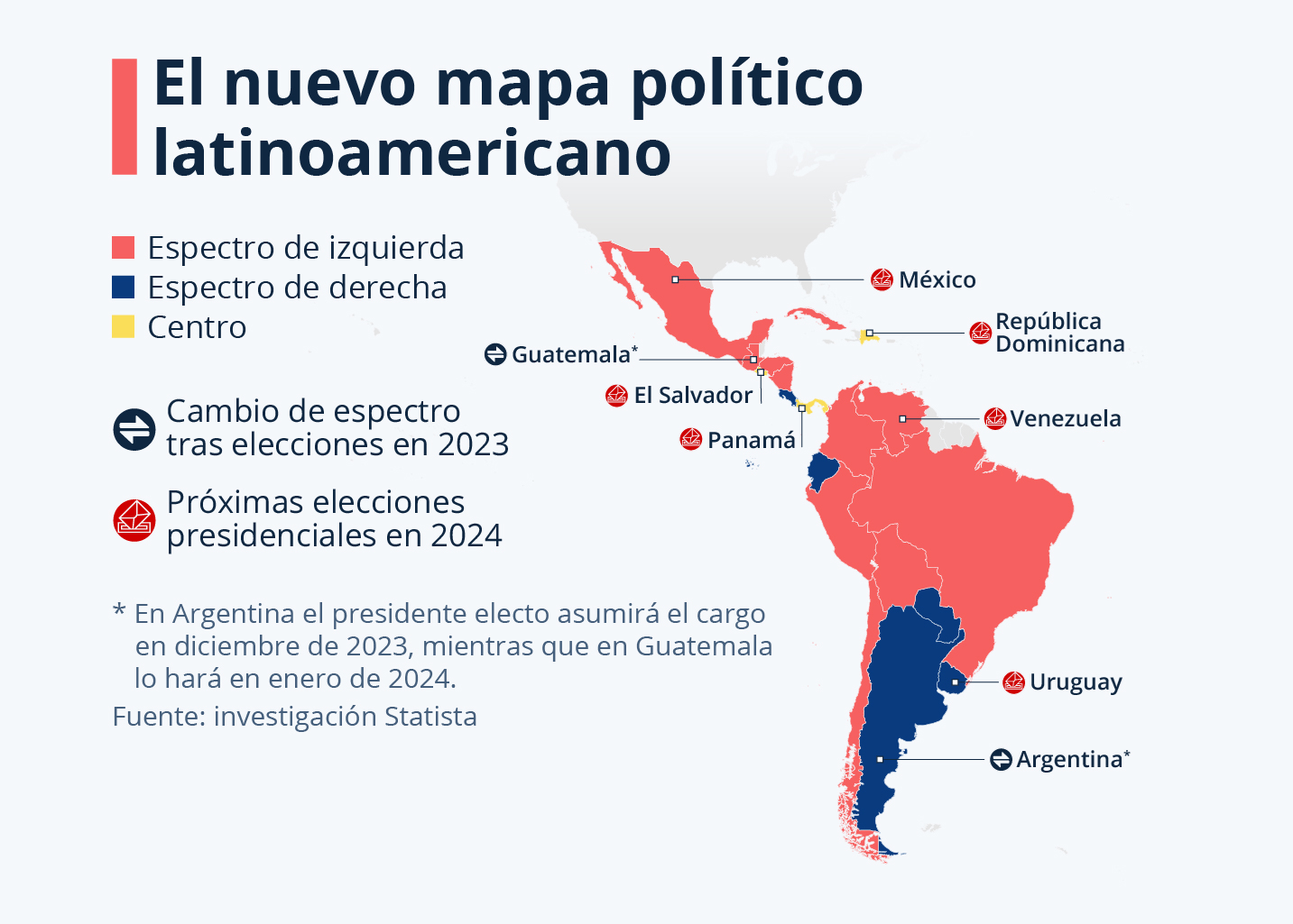 Pese a estos cambios, la mayoría de los países latinoamericanos continúan navegando bajo banderas de izquierda, lo que resalta una polarización ideológica creciente. En esta variedad política, países como El Salvador, Panamá y República Dominicana se mantienen al margen de las clasificaciones tradicionales, evitando una identificación clara con los polos habituales. Este panorama diverso se anticipa aún más dinámico con las próximas elecciones en México, Venezuela y Uruguay en 2024.