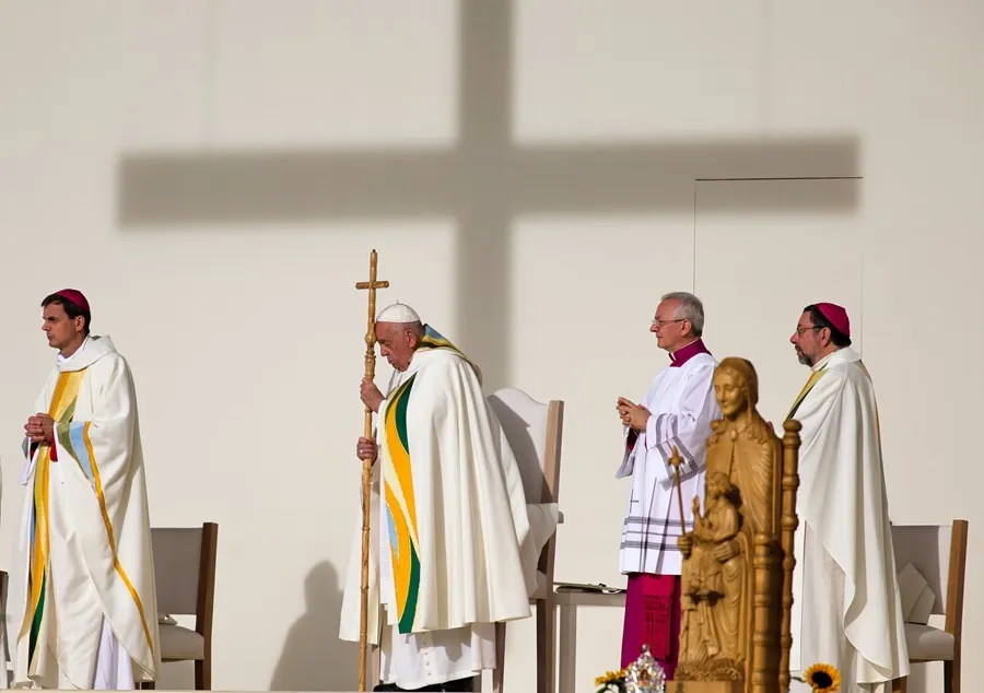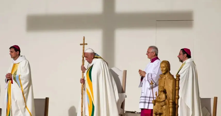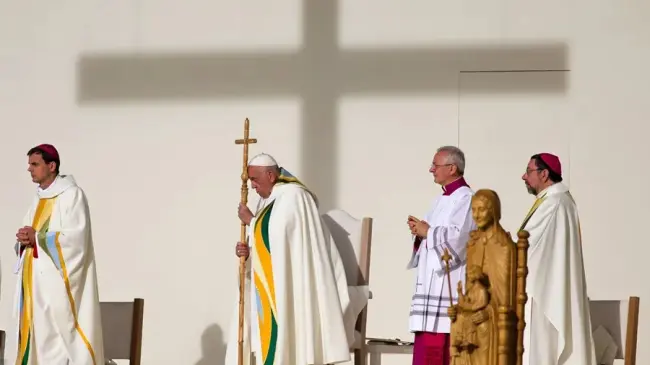 A su llegada Francisco recorrió el estadio en papamóvil entre el entusiasmo de los fieles, sobre todo de los miles de jóvenes que habían sido colocados al borde del recorrido y detuvo el vehículo en varias ocasiones para besar a los niños y bebes.