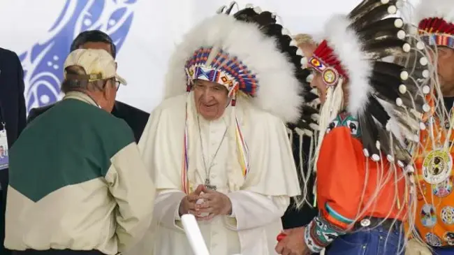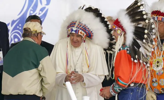 "Decirles, de todo corazón, que estoy profundamente dolido: pido perdón por la manera en la que, lamentablemente, muchos cristianos adoptaron la mentalidad colonialista de las potencias que oprimieron a los pueblos indígenas", dijo Francisco sentado entre los representantes de los jefes de los pueblos originarios y ante más de 2,000 personas, entre ellas muchas víctimas de estos internados.