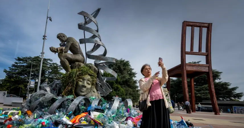 La instalación artística efímera y evolutiva, bautizada como "La carga del pensador", acompañará durante diez días las negociaciones que comienzan el martes en Ginebra con el objetivo de elaborar el primer tratado internacional para poner fin a la contaminación por plásticos en el mundo.
