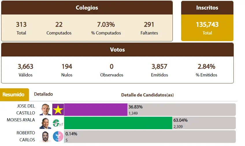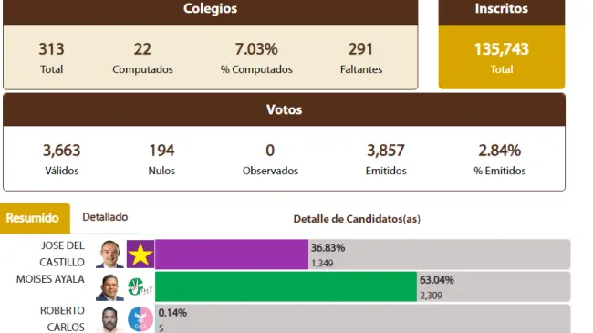 SANTO DOMINGO -.– Santo Domingo. - El Partido Revolucionario Institucional, aliado al Partido Revolucionario Moderno, avanza en las elecciones en Barahona con el candidato José del Castillo, quien ha adelantado con un porcentaje de 63.04% de los votos, de acuerdo al boletín número uno emitido por la Junta Central Electoral (JCE).