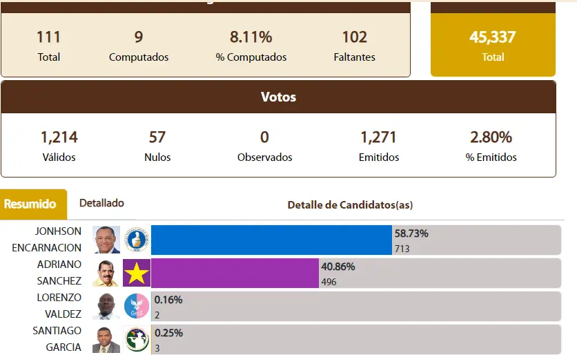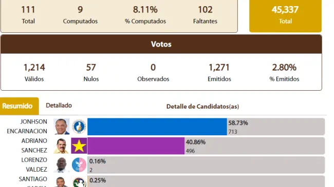SANTO DOMINGO -.– Santo Domingo. - El candidato del Partido Revolucionario Dominicano, Johnson Encarnación adelanta en las votaciones con un 58.73% de votos, según el primer boletín emitido por la Junta Central Electoral.
