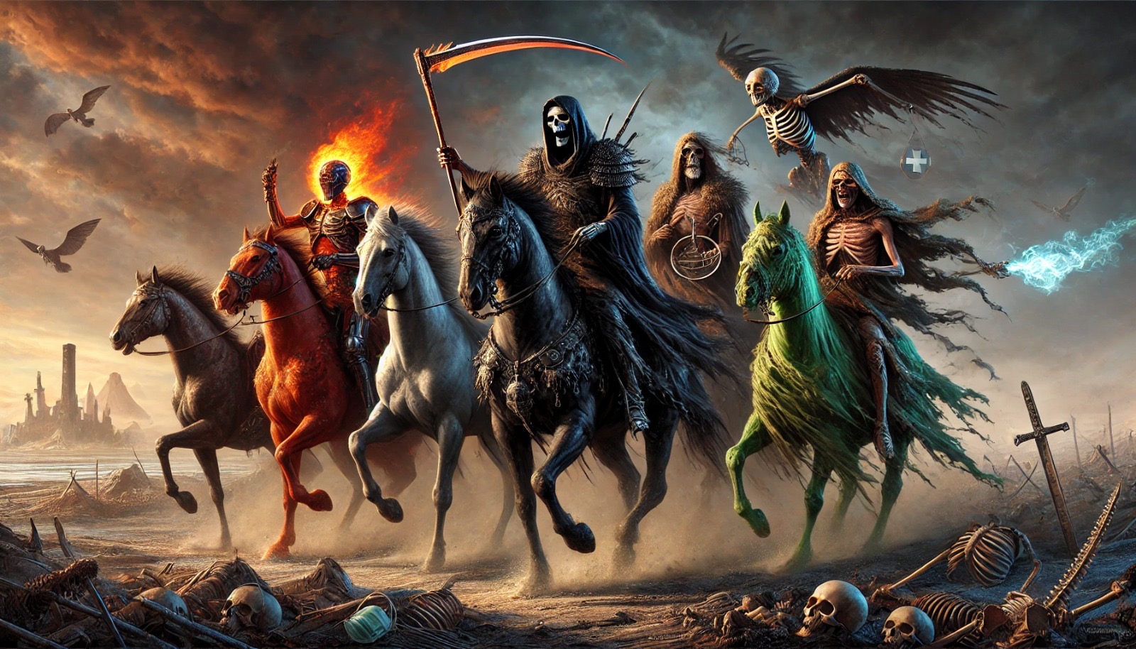 Desde tiempos inmemoriales, los Cuatro Jinetes del Apocalipsis han sido símbolos poderosos que representan las calamidades más temidas por la humanidad: Guerra, que trae conflicto y destrucción; Muerte, que siega vidas indiscriminadamente; Hambre, que provoca escasez y desesperación; y Peste, que disemina enfermedades devastadoras. Estos jinetes personifican los males que, según el libro bíblico del Apocalipsis, preceden al fin del mundo.