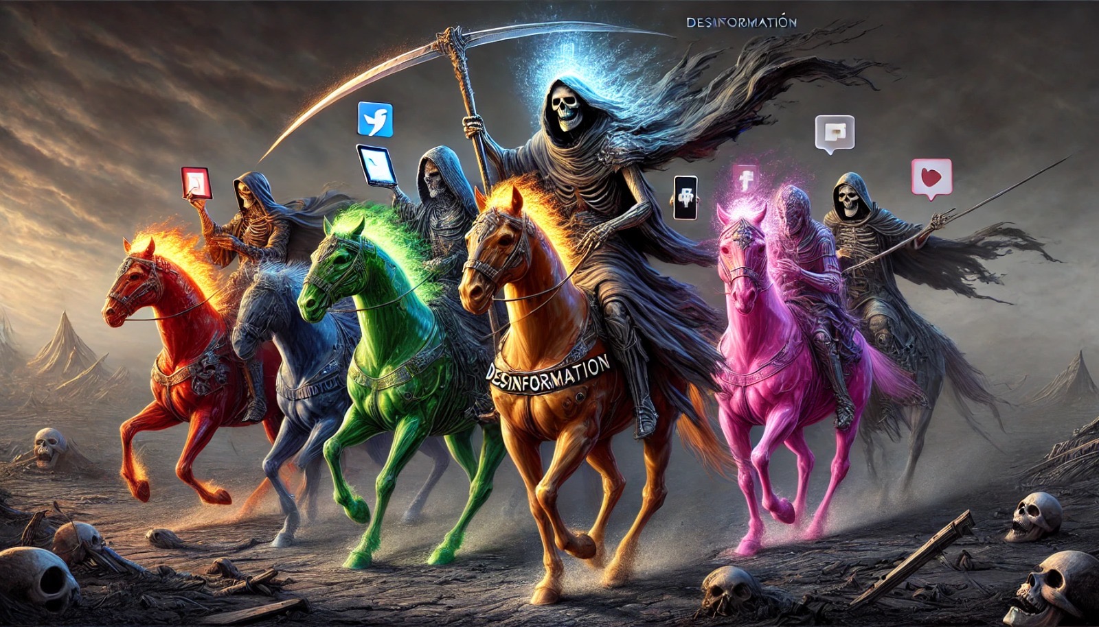 La desinformación es el jinete más peligroso porque opera en las sombras, disfrazada de verdad. A diferencia de los otros jinetes, que son amenazas visibles, la desinformación se infiltra silenciosamente en nuestras mentes y sociedades. Su capacidad para influir en la opinión pública y en las decisiones individuales y colectivas la convierte en una fuerza formidable que amplifica el poder destructivo de Guerra, Muerte, Hambre y Peste.