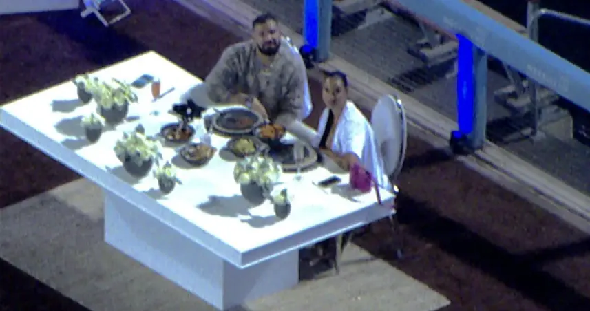 Un reportero de la ABC que sobrevolaba en helicóptero la zona de Los Angeles, se dio cuenta de toda la escena tomó un par de fotos de la pareja disfrutando su cena romántica ubicada en la tercera base del campo.