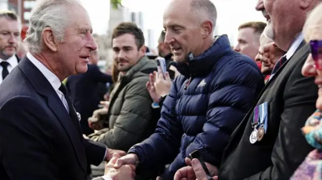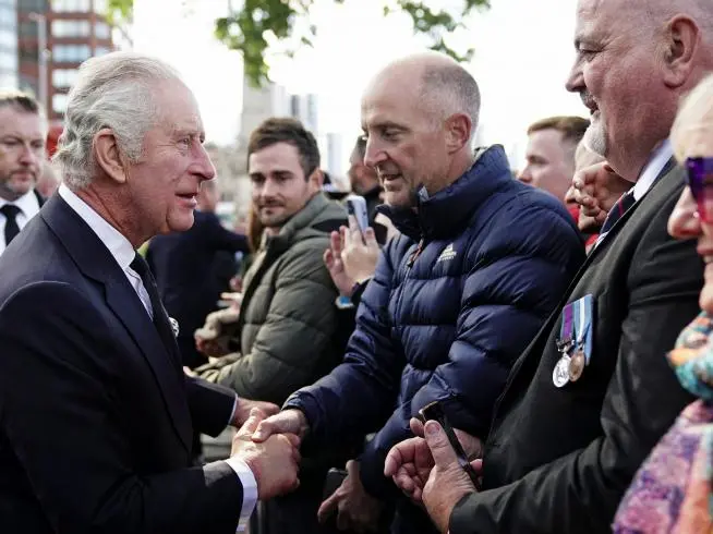 El soberano pasó más de veinte minutos estrechando manos y departiendo con los ciudadanos que llevaban ya horas a orillas del río Támesis aguardando a su turno para honrar el féretro de lsabel II.