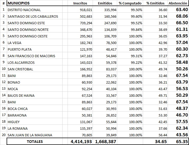 La jornada cerró con un 65.35% de abstención en los 20 municipios principales, superando incluso la ya baja participación del 48.9% en las elecciones municipales de 2020. Este dato es aún más significativo si consideramos que estos municipios representan el 51% del electorado dominicano.