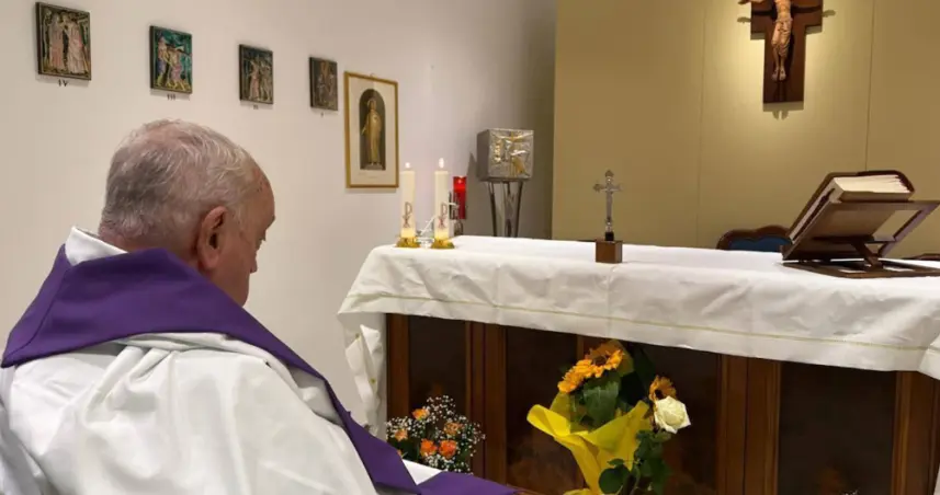En la foto, el papa aparece en la silla de ruedas frente al altar vestido de blanco y con una estola morada, el color que utilizan durante las celebraciones en el periodo de cuaresma, con ocasión de la misa de esta mañana.