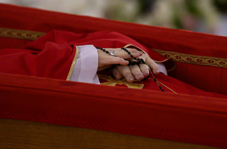 Francisco yace dentro de un féretro de madera forrado en terciopelo rojo, dispuesto en la capilla privada de la residencia, donde permaneció rodeado de sus colaboradores más cercanos y numerosos cardenales presentes en Roma.