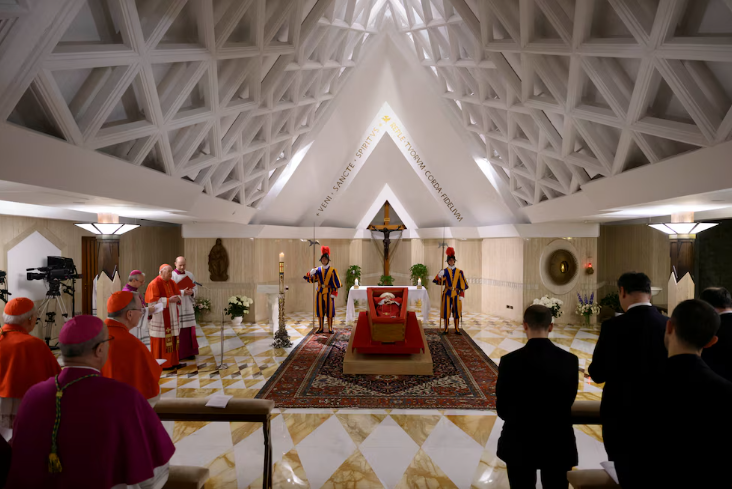 Francisco yace dentro de un féretro de madera forrado en terciopelo rojo, dispuesto en la capilla privada de la residencia, donde permaneció rodeado de sus colaboradores más cercanos y numerosos cardenales presentes en Roma.