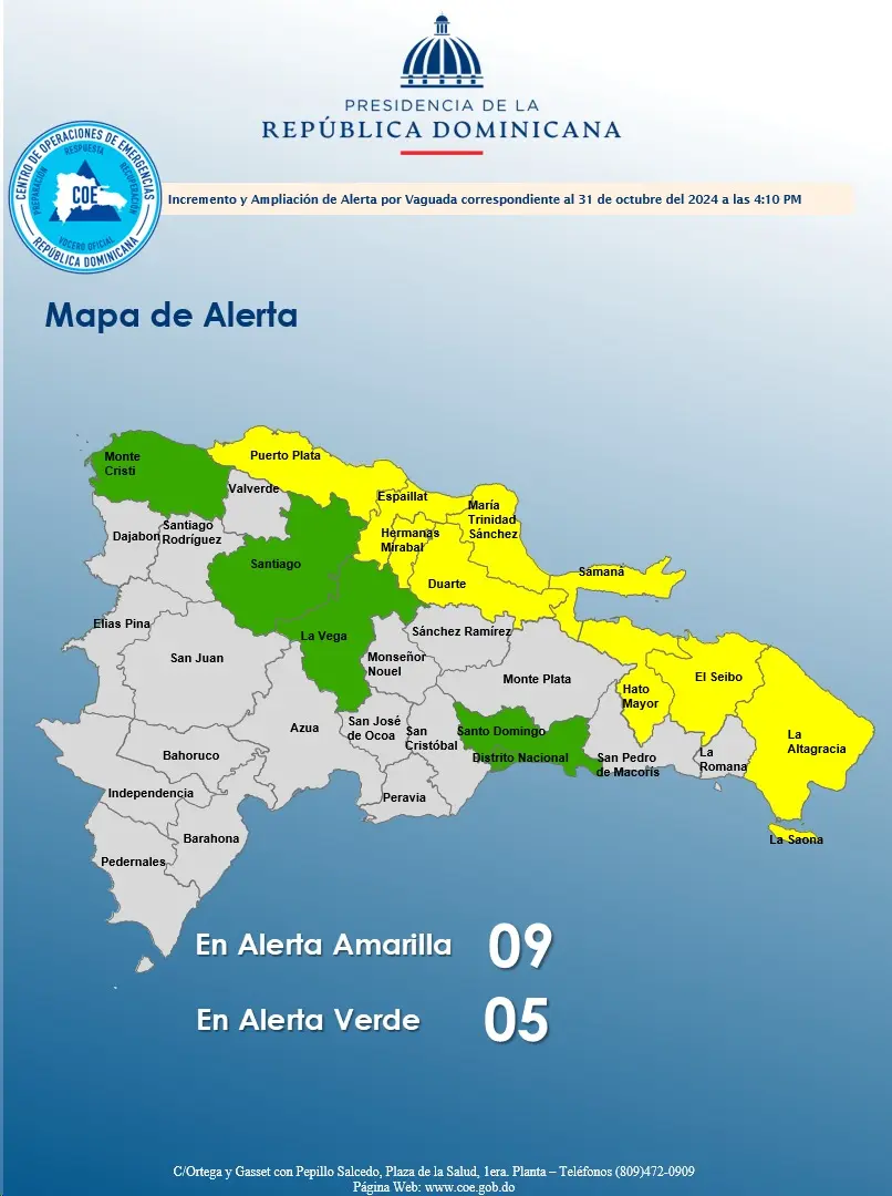 En este sentido,  las provincias que se encuentran en alerta amarilla son: Puerto Plata, Hato Mayor, Duarte, María Trinidad Sánchez, Espaillat, El Seibo, Hermanas Mirabal, Samaná y La Altagracia y en verde, Montecristi, Distrito Nacional, Santo Domingo, Santiago y La Vega.