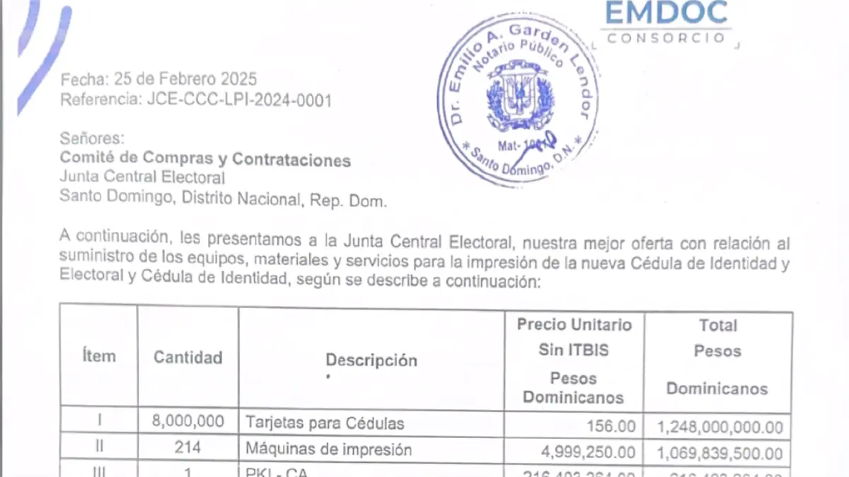 SANTO DOMINGO. – La empresa EMDOC, única en superar las pruebas técnicas para la licitación de la nueva cédula de identidad biométrica, presentó este martes su oferta económica por un valor de RD$3,363,322,412, durante la apertura oficial del sobre, realizada siete meses después de su depósito.