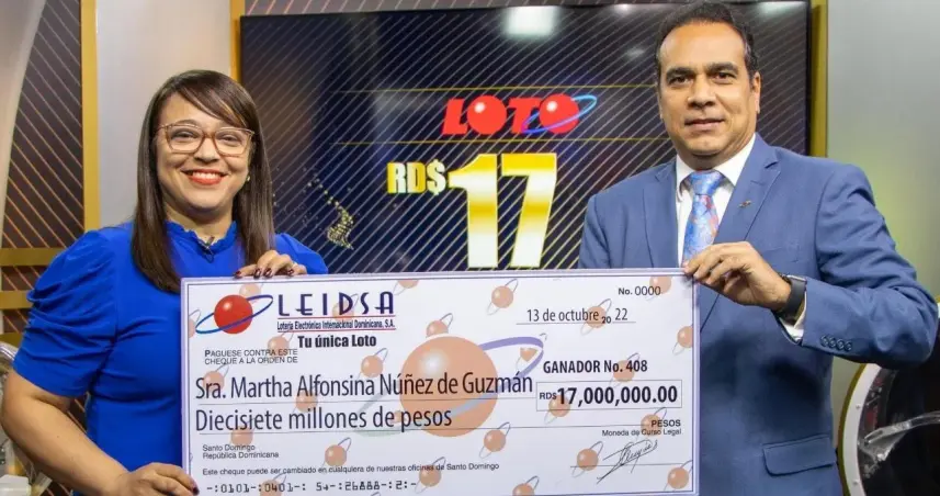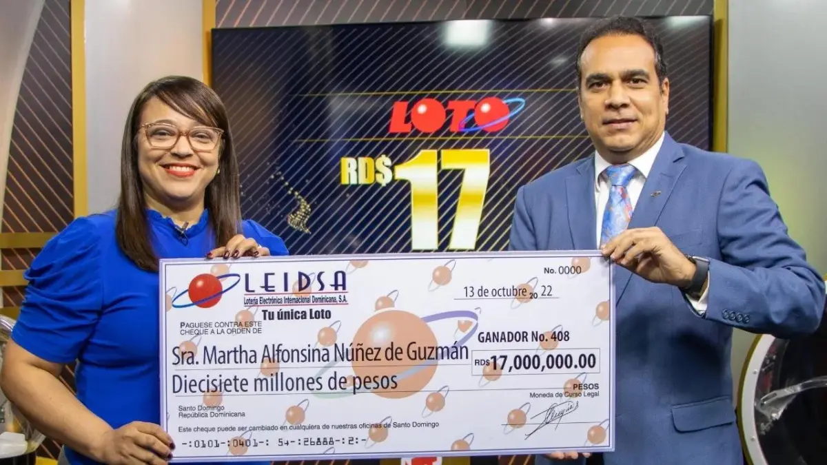 Santo Domingo.- La Lotería Electrónica Internacional Dominicana, S.A. (LEIDSA) entregó a la señora Martha Alfonsina Núñez León de Guzmán su premio de 17 millones de pesos, valor que tenía acumulado el sorteo del pasado sábado 24 de septiembre.