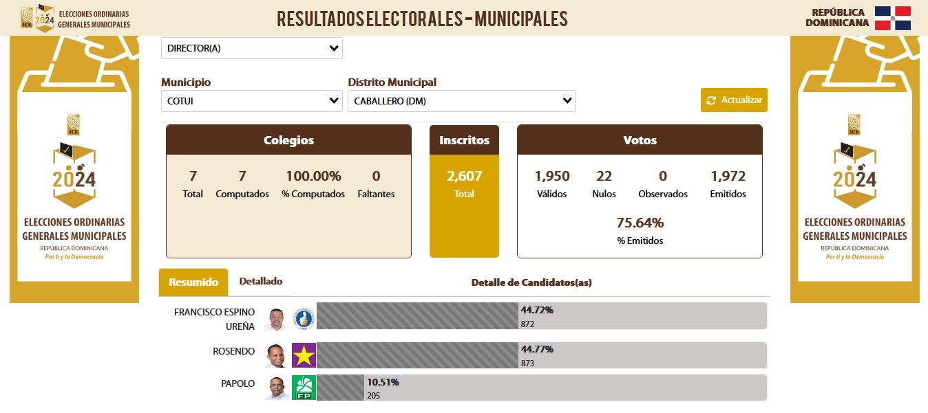 Santo Domingo.– SANTO DOMINGO.- En el municipio Cotuí, distrito municipal Caballero, el candidato Rosendo del Partido de la Liberación Dominicana (PLD) ganó las elecciones municipales celebradas este domingo frente a Francisco Espino Ureña del Partido Revolucionario Moderno (PRM).