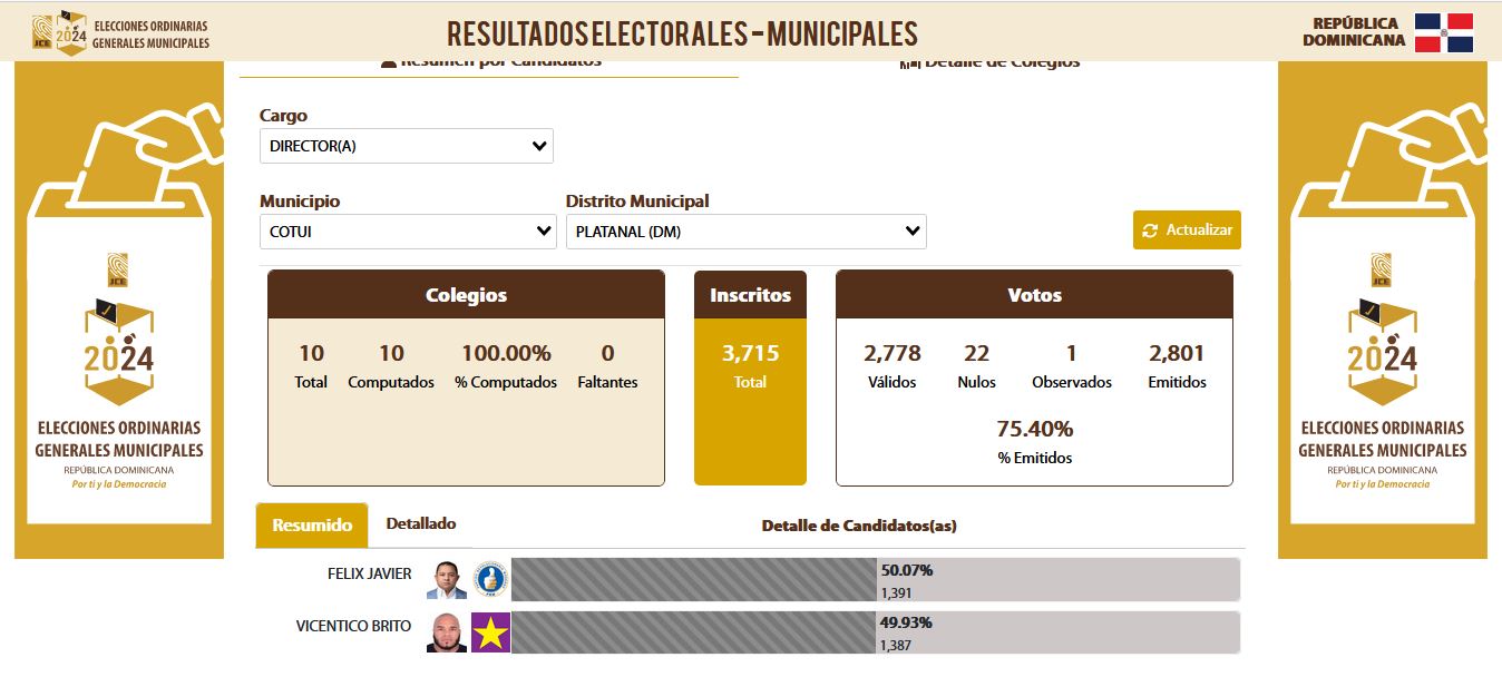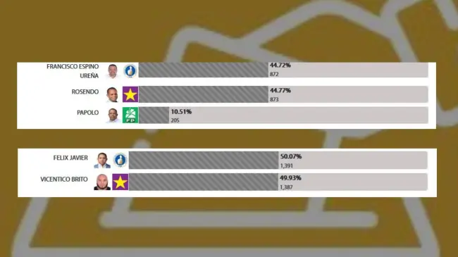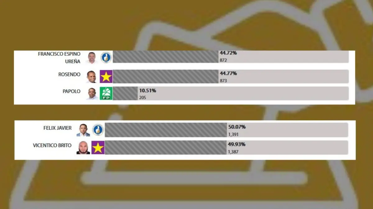 Felix Javier del Partido Revolucionario Moderno (PRM) alcanzó un 50.07% para un total de 1,391, y Vicentico Brito del Partido de la Liberación Dominicana (PLD) obtuvo un 49.93% con un total de 1,387.
