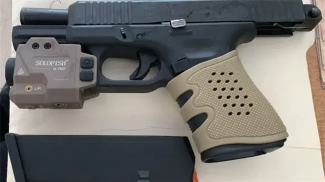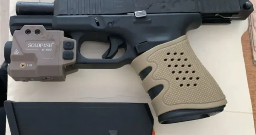 - En el registro, a Peña Brito se le ocupó una pistola Glock con accesorio selector de fuego, mira láser y dos cápsulas. Dentro del vehículo también fue encontrado un casquillo calibre 9 mm.