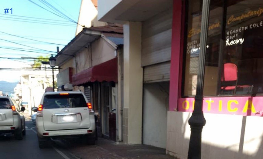 15.- Foto 1. Una señora, de unos cuarenta años de edad, mientras transitaba en una hermosa yipeta, de sur a norte por la calle Mella de la ciudad de Santiago de los Caballeros, interesada en ver de cerca la exhibición de unos lentes colocados en la vitrina de una óptica, detiene su vehículo sobre la calzada, para ver las gafas o lentes que están en el escaparate.