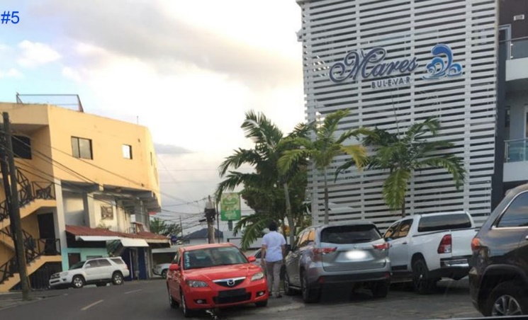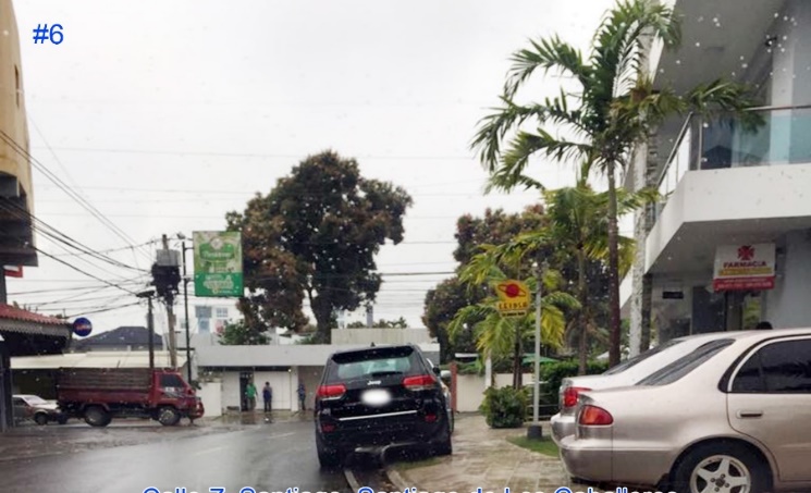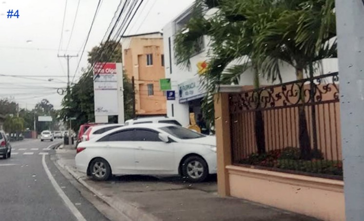 21.- Foto 7. El conductor de este vehículo blanco, un joven de unos 35 años de edad, porque no encontró espacio libre para estacionarse cerca del Banco donde se disponía hacer una gestión, ocupó la puerta de entrada principal de un parqueo privado reservado para los clientes de un restaurante.
