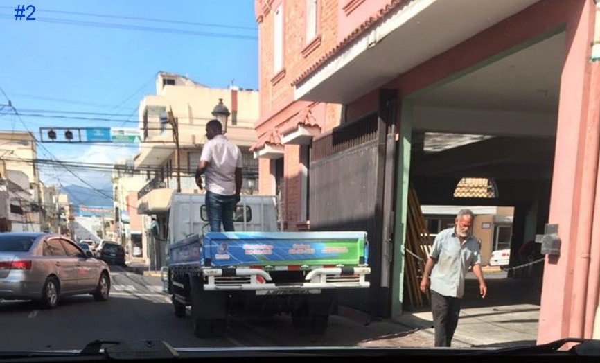 16.- Foto 2. El conductor de un vehículo de carga, interesado en depositar unas mercancías en un almacén ubicado en la calle Mella, casi esquina Independencia, en Santiago, sube el camión sobre la calzada para estar más cerca del lugar donde ha de depositar los bultos.