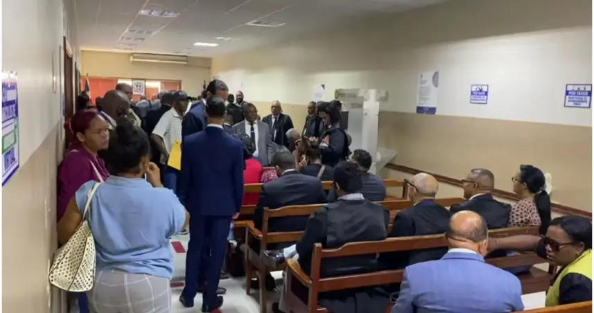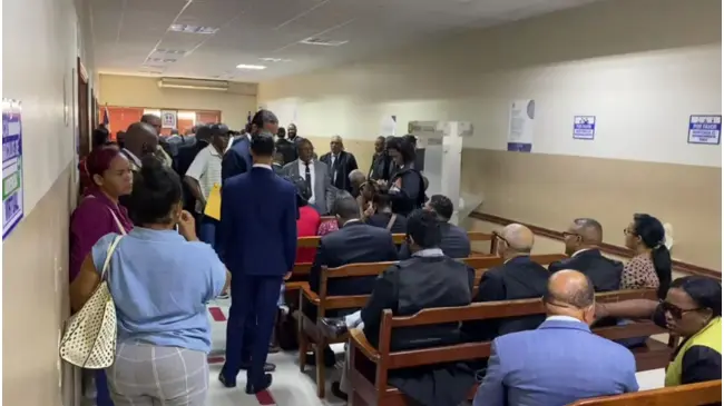 El lugar que da acceso a otros tribunales de esa sede judicial que operan como de costumbre este día, fue acondicionado con asientos y un estrado para el juez de la Oficina de Atención Permanente de Santo Domingo Oeste, Máximo Roa Saint Hilaire.