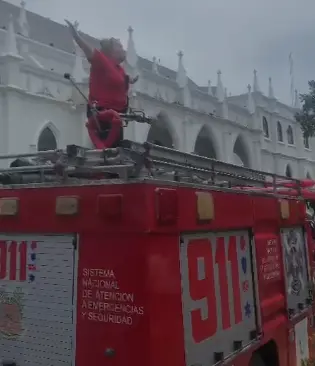 Asimismo, se observa a la jefa del Cuerpo de Bomberos, encima de uno de los camiones manifestando su indignación.