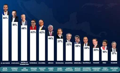 Los resultados del sondeo indican que es superado por Nayib Bukele, presidente del Salvador, con un 86%, ocupando el primer lugar, y Rodrigo Cháves, de Costa Rica, con 80%, el segundo lugar.