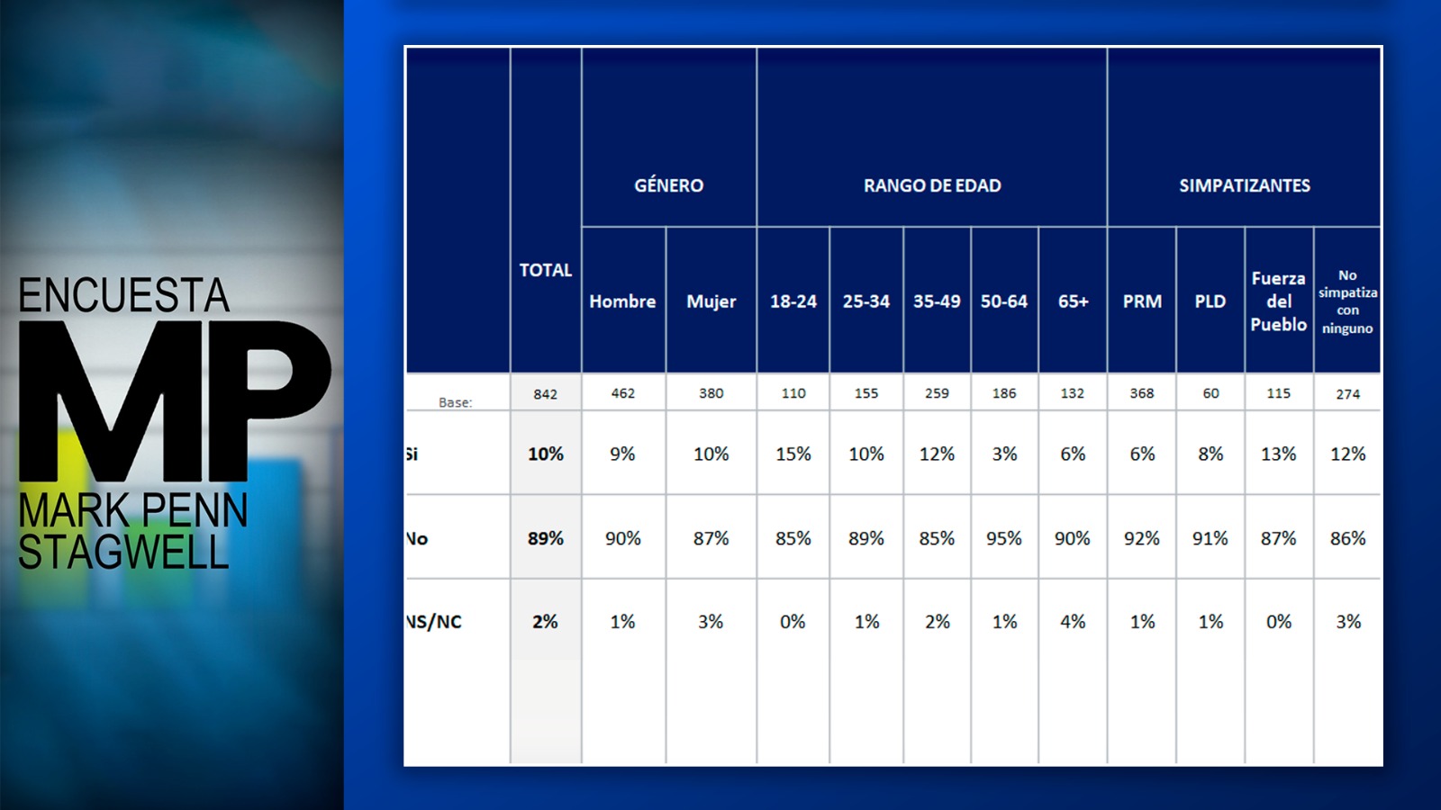 Mark Penn / Stagwell (certificado No. 2019-09-046 de la JCE) efectuó esta encuesta de cara a cara ante 1,206 encuestados quienes han indicado que de seguro probablemente votarán en mayo del 2024. El trabajo de campo fue realizado entre el 25 y el 28 de abril, es decir después del debate electoral. El margen de error es de más o menos 2.8%. Los datos fueron ponderados para ser representativos de la población dominicana, y el público con mayor probabilidad de votar en mayo de 2024 se identifica entre esta población. Los resultados están analizados por género, edad, y educación.