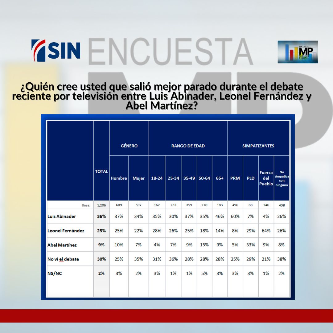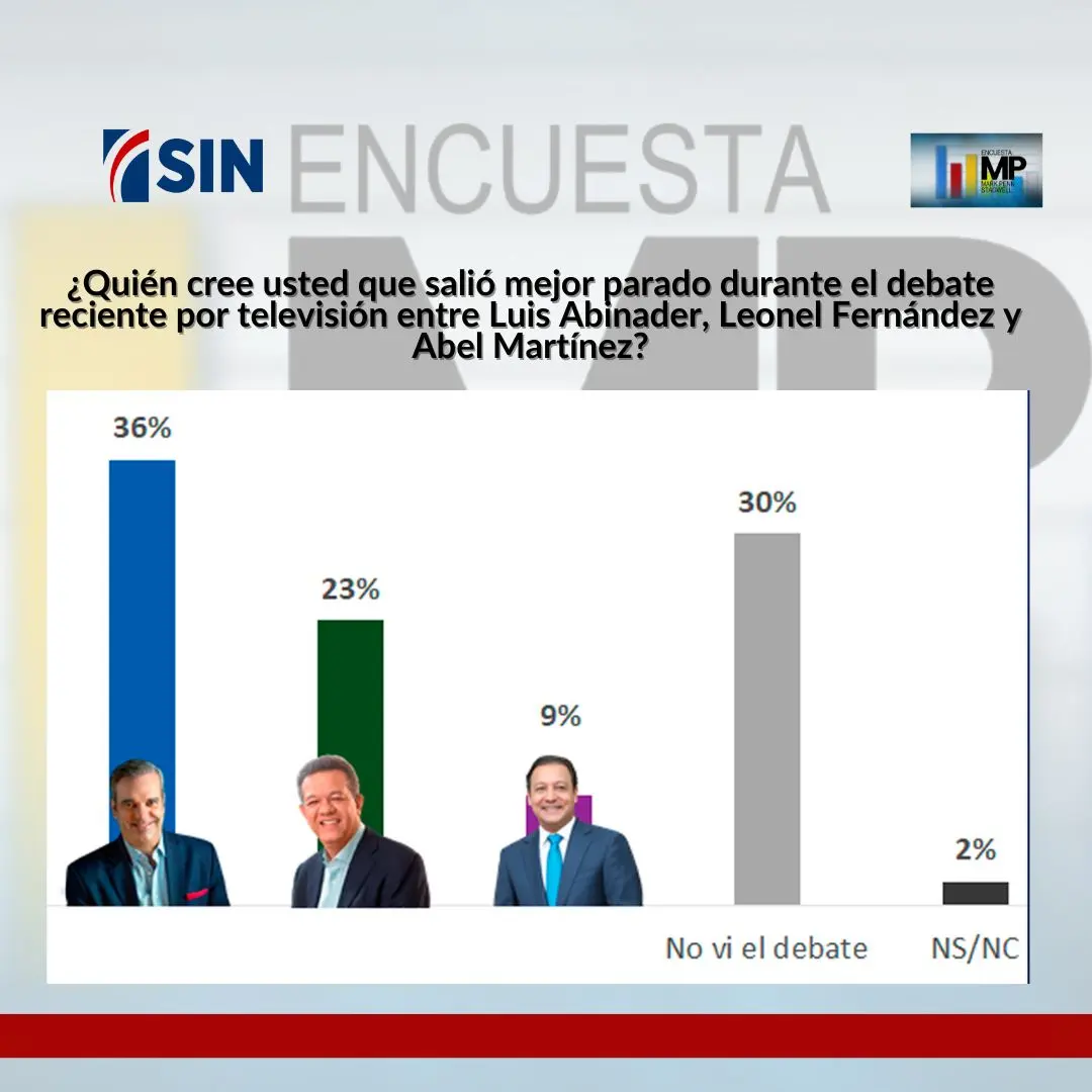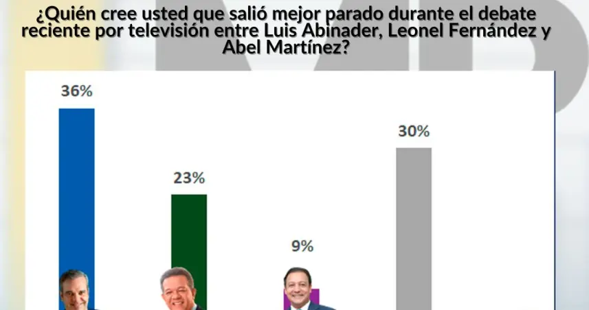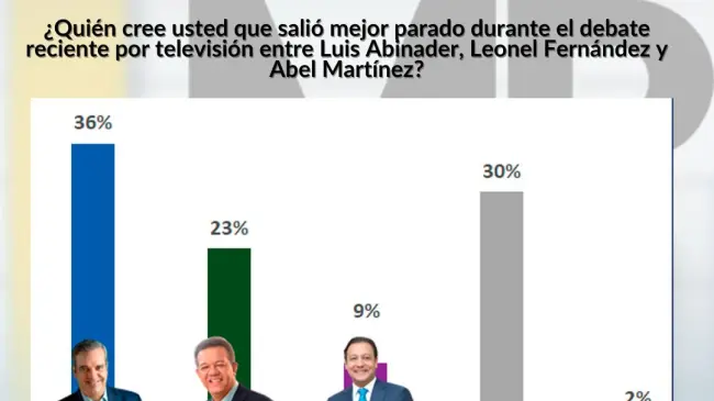 Un 36% de los entrevistados durante el debate consideró que Luis Abinader quedó mejor parado contra un 23% que mencionó a Leonel Fernández y un 9% que citó a Abel Martínez. Un 60% de los perremeístas y un 64% de los simpatizantes de la Fuerza del Pueblo indicaron que Luis Abinader y Leonel Fernández quedaron mejor parados. Sin embargo, entre los peledeístas apenas un 33% citó a Abel Martínez y un 29% a Leonel Fernández. Un alto 38% de los independientes no vio el debate y en cuanto a quién quedó mejor parado se dividió en un 26% respectivamente entre Luis Abinader y Leonel Fernández.