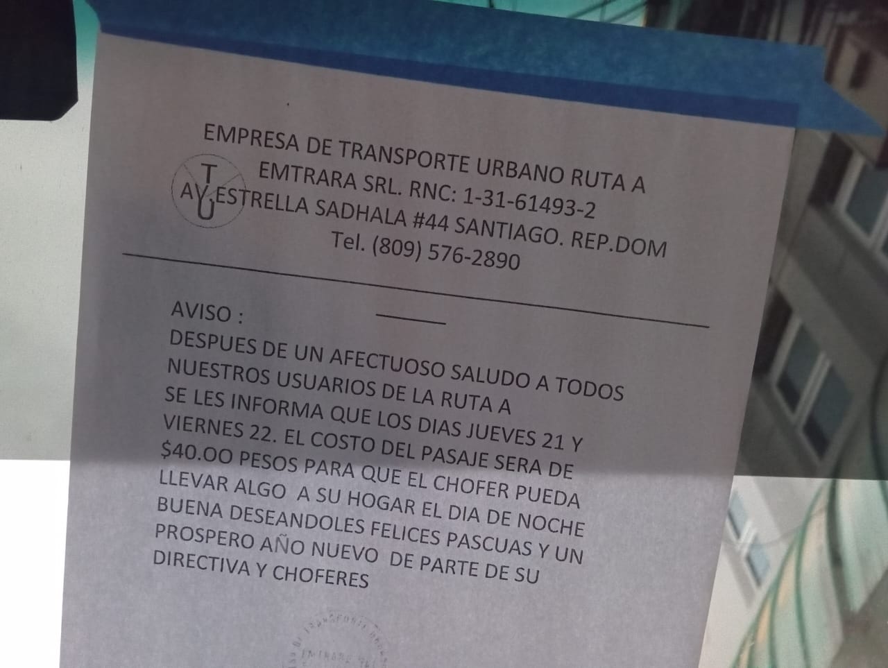 “Después de un afectuoso saludo a todos nuestros usuarios de la ruta A, se les informa que los días jueves 21 y viernes 22, el costo del pasaje será de RD$40.00 para que el chofer pueda llevar algo a su hogar el día de Nochebuena. Deseándoles felices pascuas y un próspero Año Nuevo de parte de su directiva y choferes”, reza uno de los comunicados.