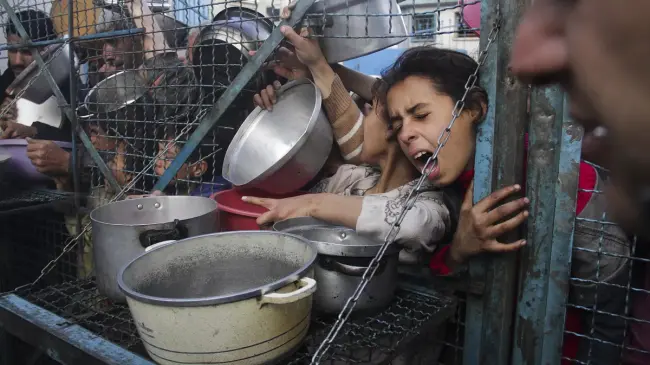 REDACCIÓN INTERNACIONAL-.– REDACCIÓN INTERNACIONAL- En un comedor social de la ciudad de Jan Yunis, Gaza, decenas de palestinos se enfrentaron a gritos y empujones para conseguir un plato de comida caliente, evidenciando la grave crisis humanitaria que afecta la región.