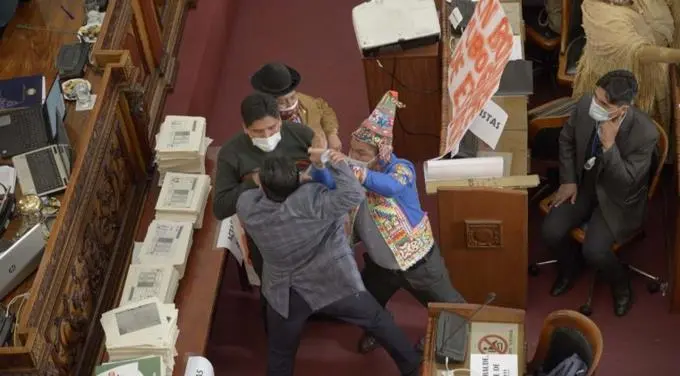 Tras aquello, la misma escena se repitió entre dos legisladoras una del MAS y otra opositora que también se enfrentaron entre jalones de pelo y rasguños, por lo que Mamani se vio forzado a declarar diez minutos de pausa para luego reinstalar la sesión.