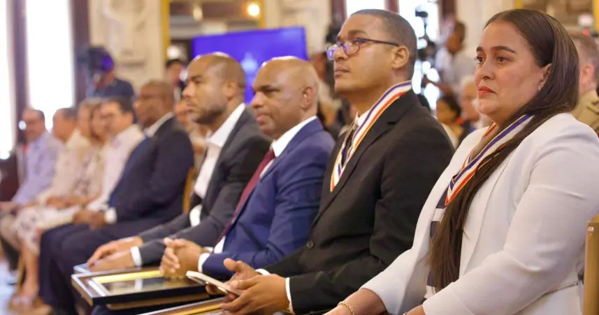 La vicepresidenta Raquel Peña y la primera dama Raquel Arbaje, acompañaron al mandatario en el Salón Las Cariátides del Palacio Nacional, donde también fueron galardonados 10 maestros en Excelencia Docente por las instituciones de Educación Superior de la República Dominicana.