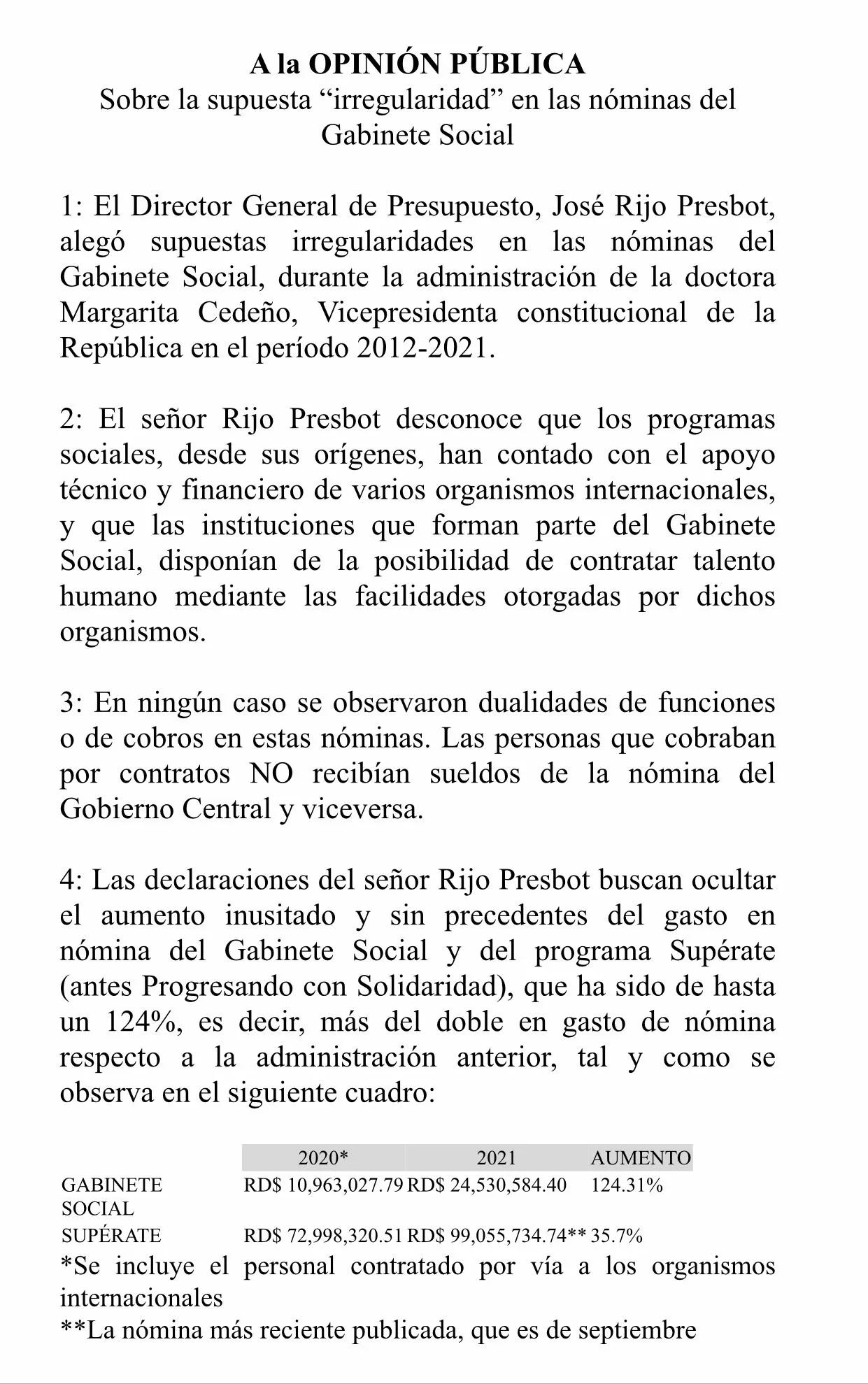 El documento se publica en respuesta a las declaraciones del director general de Presupuesto, José Rijo Presbot, quien alegó supuestas irregularidades en las nóminas del Gabinete Social durante la administración de la doctora Margarita Cedeño, en el período 2012-2020, y señala que con ello se pretende afectar sin fundamento a la figura política que más preocupa al Gobierno.