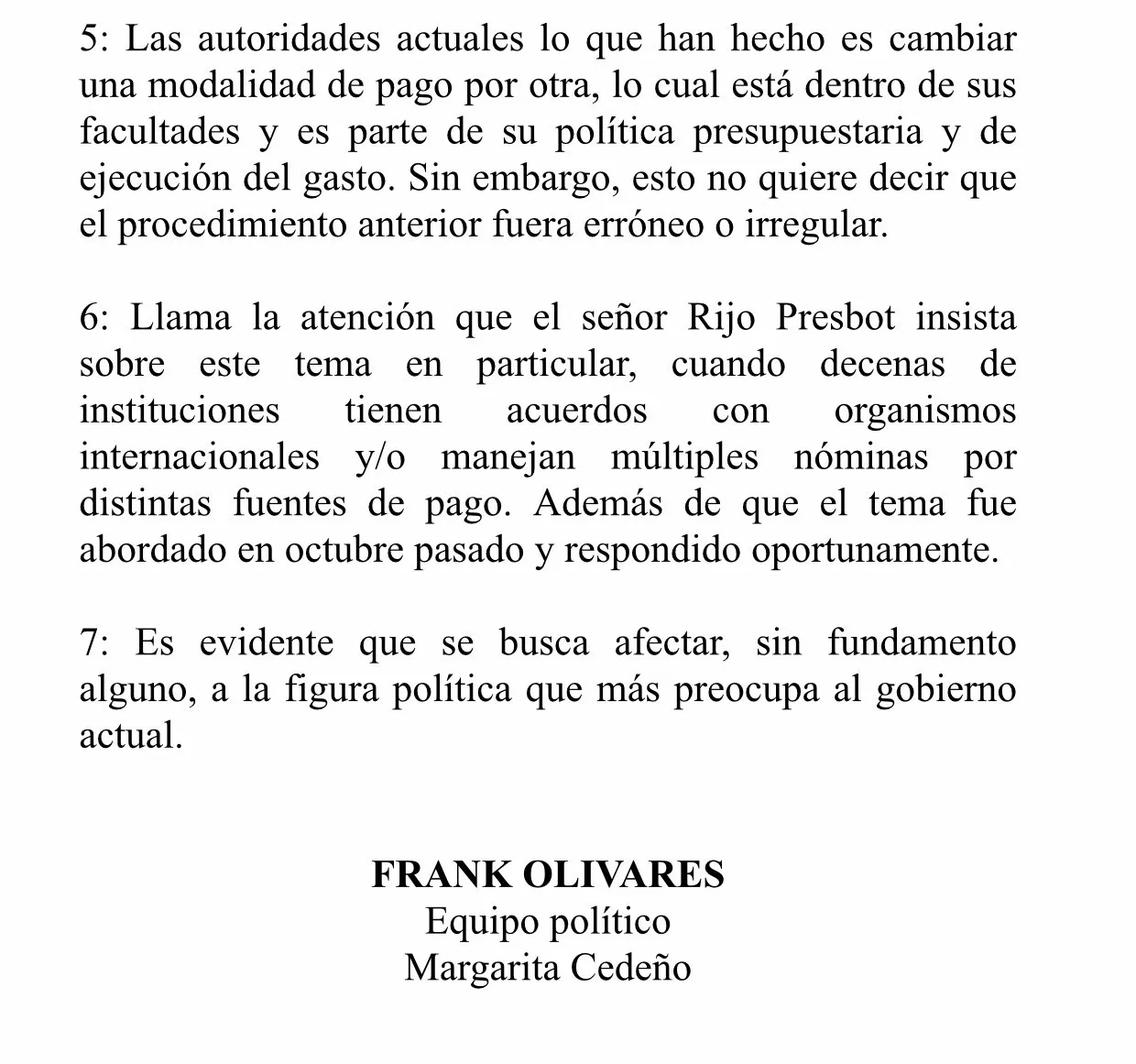 “Las declaraciones del señor Rijo Presbot buscan ocultar el aumento inusitado y sin precedentes del gasto en nómina del Gabinete Social y del programa Supérate, que ha sido de hasta un 124 por ciento, es decir, más del doble en gasto de nómina respecto a la administración anterior”, indica el comunicado firmado por Frank Olivares en nombre del equipo político.