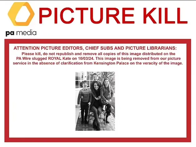Varias agencias gráficas internacionales retiraron de sus servicios por la presunta manipulación digital la fotografía difundida el domingo, la primera con Kate desde que fue sometida a una "operación abdominal" de la que se desconocen los detalles el pasado 16 de enero.