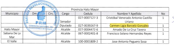 En ese orden, Carmen Ligia Barceló González, esposa del ministro de la Presidencia, Joel Santos, resultó ganadora dentro de los modelos de encuestas implementados por el partido oficialista para optar por una diputación en la provincia Hato Mayor.