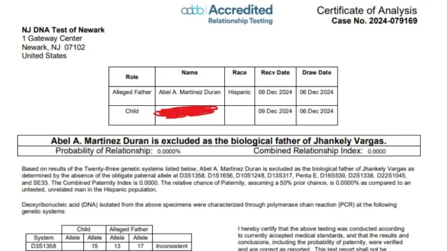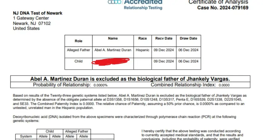 La prueba de ADN fue realizada en un laboratorio en Newark, Estados Unidos, y concluyó que Abel Martínez no es el padre biológico del menor cuya madre había asegurado la paternidad.