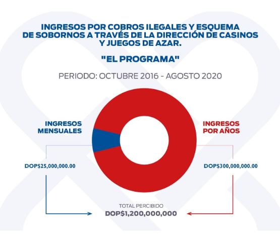 “Los acusados Oscar Arturo Chalas Guerrero (01 de septiembre del 2016 hasta 18 de marzo del 2019;), y Julián Omar Fernández Figueroa (01 de abril del año 2019 hasta el 19 de agosto del año 2020) quienes fueron directores de casino por su participaron recibieron soborno de pagos mensuales de dos millones de pesos en efectivo (DOP 2,000,000.00) mensuales”, indica la acusación.