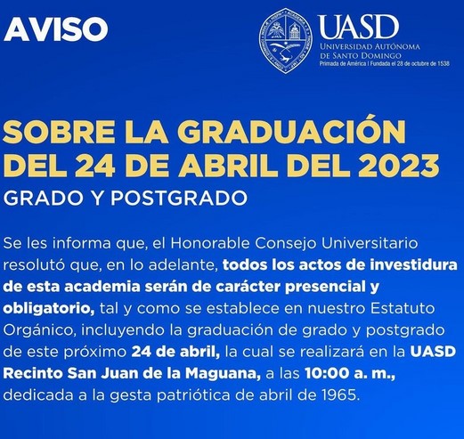 “Se les informa que, el Honorable Consejo Universitario resultó que, en lo adelante, todos los actos de investidura de esta academia serán de carácter presencial y obligatorio, tal y como se establece en nuestro Estatuto Orgánico, incluyendo la graduación de grado y postgrado de este próximo 24 de abril, la cual se realizará en la UASD Recinto San Juan de la Maguana, a las 10:00 a. m., dedicada a la gesta patriótica de abril de 1965”.