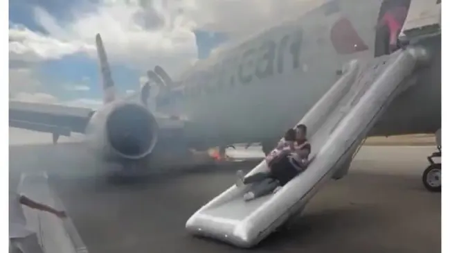 Videos publicados en redes sociales y reproducidos en los medios locales mostraron a los pasajeros evacuando frenéticamente el avión por un tobogán de emergencia, mientras el humo salía por la parte de atrás del aparato.
