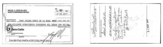 Según el órgano acusador, Pérez de la Rosa fungía como prestanombres de su hijo en transacciones que involucraban altas sumas de dinero provenientes de personas vinculadas al narcotráfico, como este cheque del acusado de narcotráfico, Miguel A. López Pilarte.